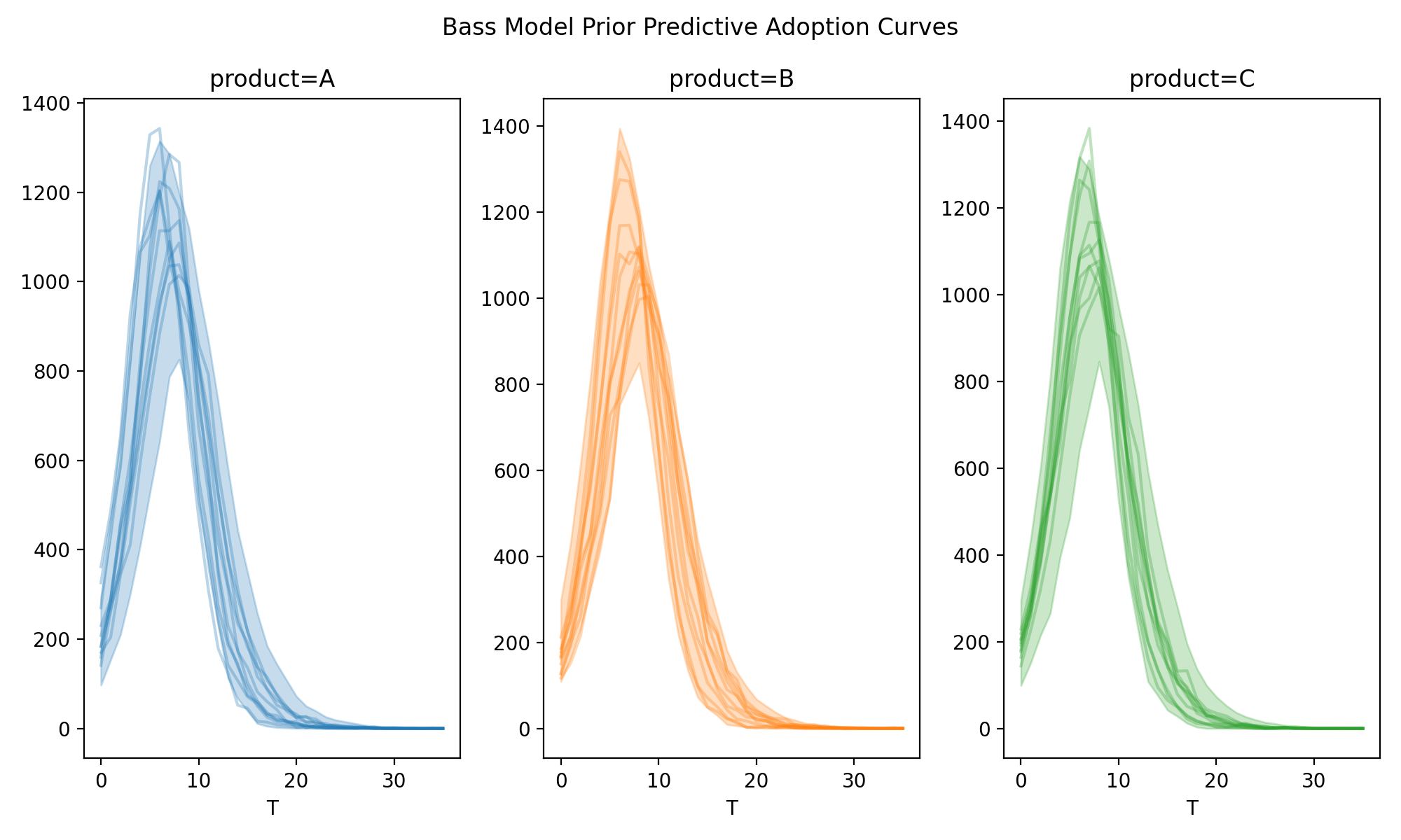 This implementation provides a Bayesian version of the Bass model using PyMC, allowing for: - Uncertainty quantification through prior distributions - Hierarchical modeling for multiple products/markets - Extension to incorporate additional factors