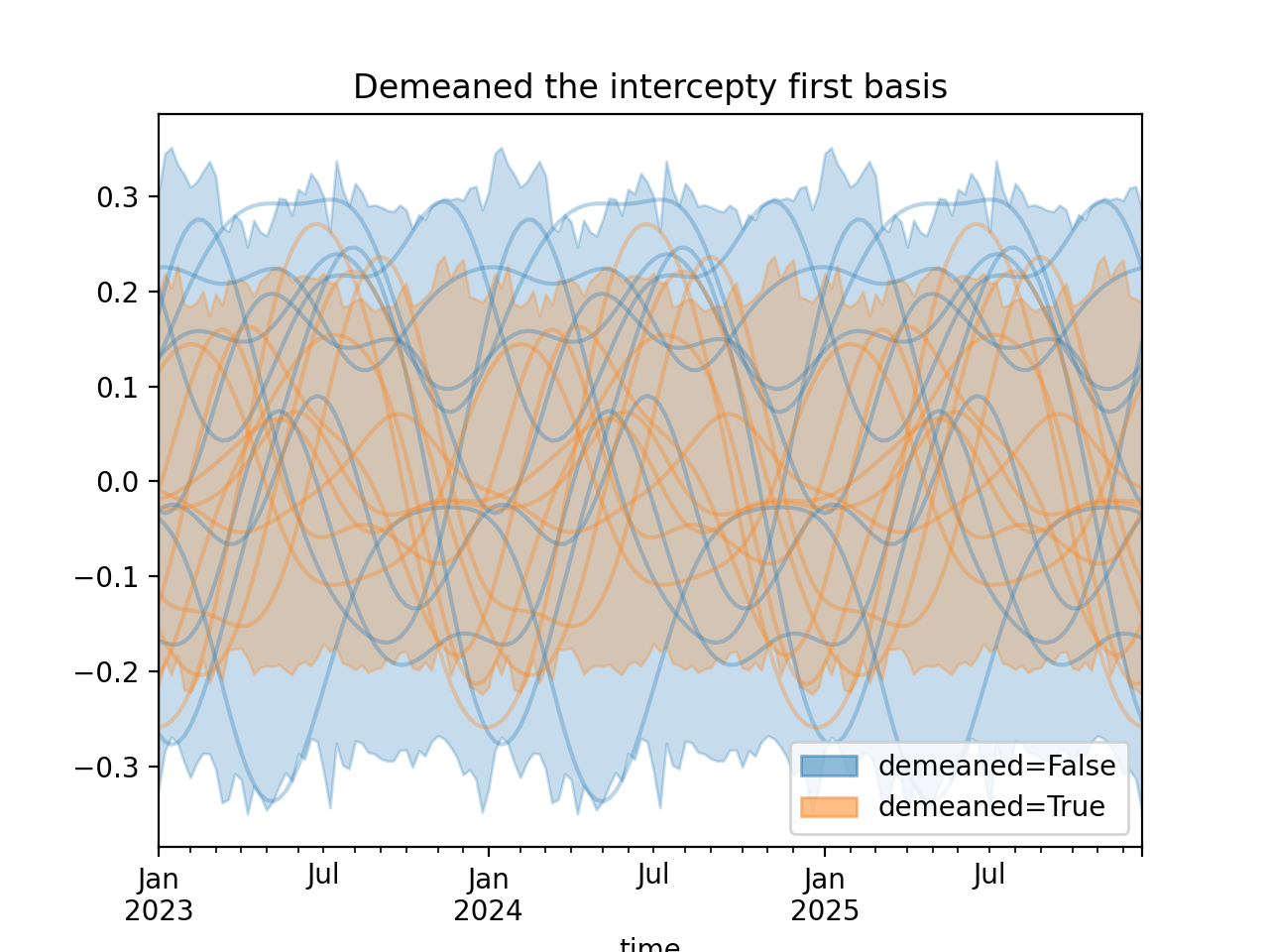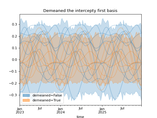 import numpy as np import pandas as pd import xarray as xr import matplotlib.pyplot as plt from pymc_marketing.mmm import HSGPPeriodic from pymc_marketing.plot import plot_curve seed = sum(map(ord, "Periodic GP")) rng = np.random.default_rng(seed) scale = 0.25 ls = 1 kwargs = dict(ls=ls, scale=scale, period=52, cov_func="periodic", dims="time", m=20) n = 52 * 3 dates = pd.date_range("2023-01-01", periods=n, freq="W-MON") X = np.arange(n) coords = {"time": dates} hsgp = HSGPPeriodic(demeaned_basis=False, **kwargs).register_data(X) hsgp_demeaned = HSGPPeriodic(demeaned_basis=True, **kwargs).register_data(X) def sample_curve(hsgp): return hsgp.sample_prior(coords=coords, random_seed=rng)["f"] non_demeaned = sample_curve(hsgp).rename("False") demeaned = sample_curve(hsgp_demeaned).rename("True") combined = xr.merge([non_demeaned, demeaned]).to_array("demeaned") _, axes = combined.pipe(plot_curve, "time", same_axes=True) axes[0].set(title="Demeaned the intercepty first basis") plt.show()