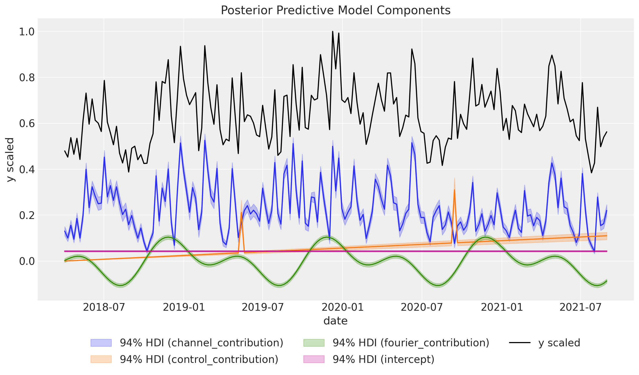 • Time-varying Intercept: Capture time-varying baseline contributions in your model (using modern and efficient Gaussian processes approximation methods). That is, we allow the intercept term \(\alpha = \alpha(t)\) to vary over time. See mmm_tvp_example.
