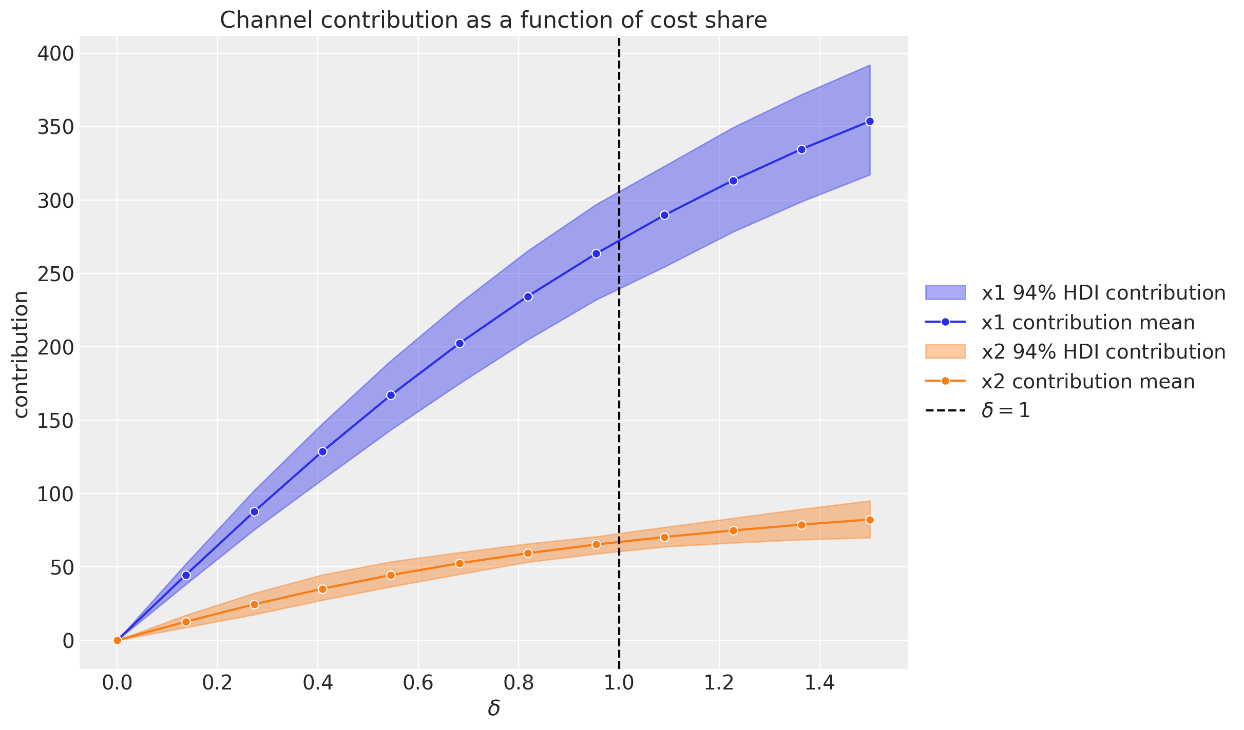 Finally we can use the model to understand the expected sales for different media spend scenarios considering the adstock and saturation effects learned from the data.